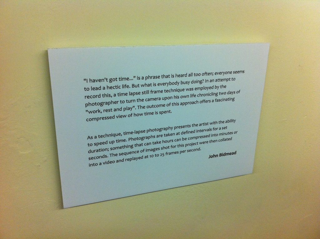 Being a bit of a geek I got into photography more for the kit as well as the quality of the images. Although I have definitely improved as a photographer over the two year course I feel I am still weak on the creative side. I’ve struggled with the open ended ‘self negotiated’ projects. I chose time-lapse because I had been fascinated by the results from my Pride and Prejudice project. I did contact sporting venues about access for crowds coming into and out of grounds, without luck. I would have liked to look at bigger grander sequences, but with a full time job, time and security of my equipment were always issues. So my project ended up being about me and what I did in my time. I am very pleased with what I have produced, but after 2 years studying as a photographer I feel I’d maybe be better with prints on the wall than a video.